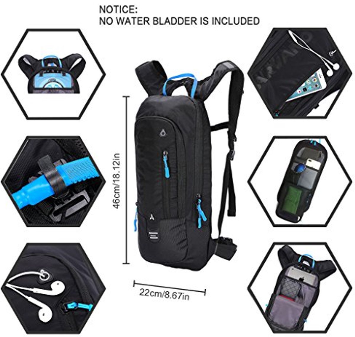 Compacte fietsrugzak, klein maar veelzijdig. Het is plat, slank en lichtgewicht, ontworpen voor mountainbikes maar perfect voor dagtochten wanneer je niet veel hoeft te dragen. Ook geschikt voor hardlopen, rijden, skiën en motor rijden. Deze rugzak is ideaal voor iedereen die van avontuurlijke buitenactiviteiten houdt. Belangrijkste kenmerken: 3 ritsvakjes voor georganiseerde opslag, verstelbare schouder-, borst- en heupbanden voor een perfecte pasvorm, ademend mesh rugpaneel voor extra comfort. Reflecterende strips voor zichtbaarheid bij late avondritten. Hydratatiesysteem (hydratatieblaas niet inbegrepen) met twee slangklemmen. Handgrepen voor eenvoudig dragen. Afmetingen: 44,5 cm lang, 22 cm breed en 5 cm hoog. Slechts 0,5 kg, ideaal voor het vervoeren van je essentials. Voorzien van een voorvak met twee-wegs rits voor je telefoon en een aparte hydratatiecompartiment met klittenband om de blaas op zijn plaats te houden.