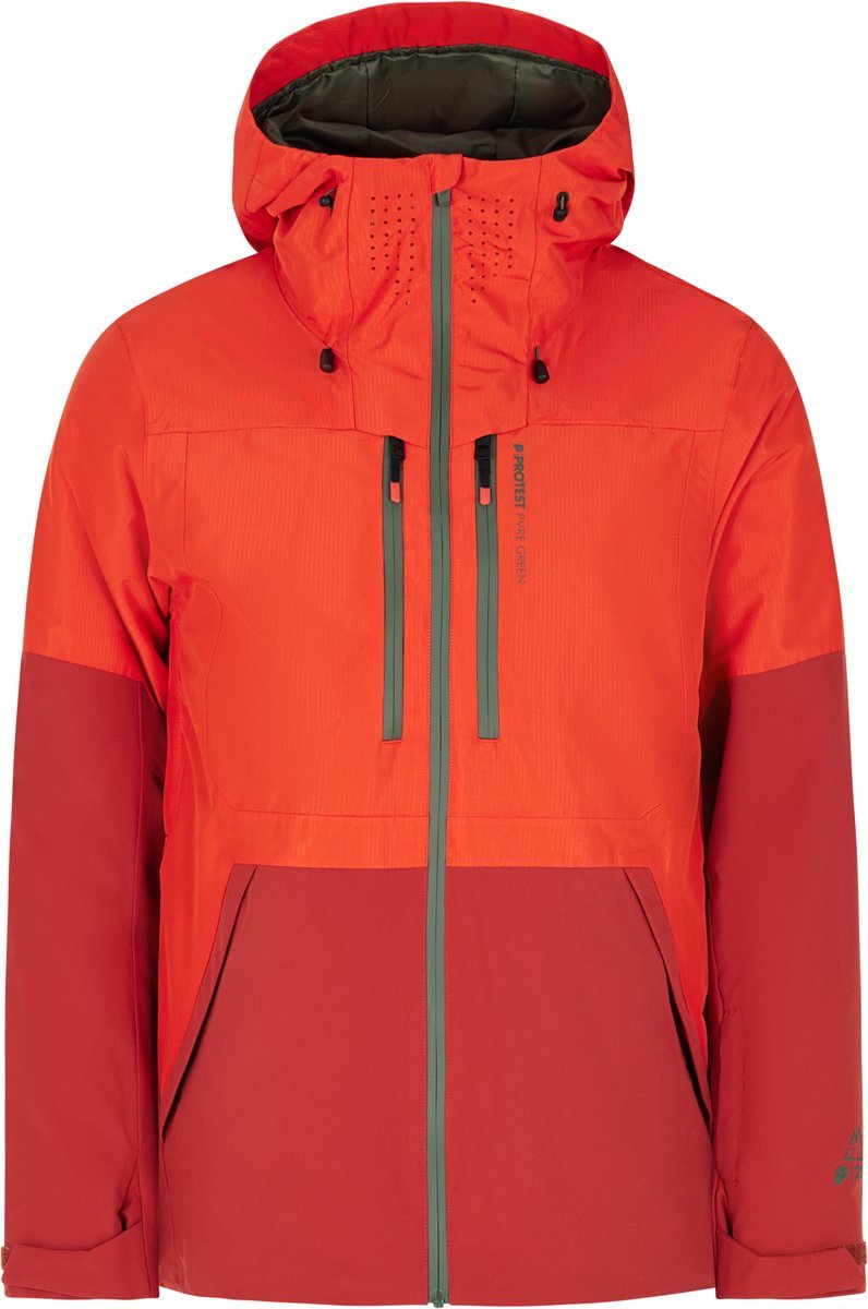 De PRTBAKIE ski- en snowboardjas van Protest combineert stijl en functionaliteit met een milieuvriendelijk design. De PRTBAKIE maakt deel uit van onze PVRE Green-serie en is gemaakt van gerecyclede materialen en is vrij van schadelijke PFC’s. De PRTBAKIE heeft veel handige design kenmerken, zoals de vaste capuchon met hoge kraag die zo ontworpen is dat hij perfect over je helm past, een zak voor de skibril, sneeuwvanger en een liftpashouder. Het 20 g ademend vermogen en de 20.000 mm waterafstotende coating voeren transpiratievocht af terwijl je beschermd bent tegen water van buitenaf. Volledig getapete naden, ventilatieritssluitingen bij de oksels en waterdichte ritssluitingen aan de voorkant? Check! De lycra binnenmanchetten met duimlus zijn erg handig voor op de pistes. De contrasterende ritssluitingen en het Protest-logo maken de look helemaal af. De PRTBAKIE is verkrijgbaar in een slim fit en lengte.