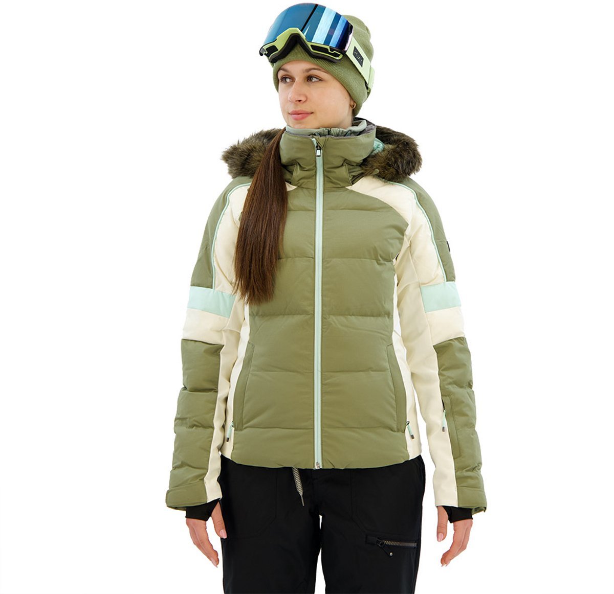 Geïsoleerde sneeuwjas voor dames.Kenmerken omvatten:Kleding stof:Dobby polyester elastaan (hoofdgedeelte), platbinding polyester elastaan (bovenarmpaneel, bies), platbinding polyester elasthaan van gerecycled polyester (zij- en onderarmpanelen), voering:Engineered ultra lichtgewicht gerecycled materiaal polyester taft met geborsteld tricot, Pasvorm:Slim fit, Technologie:15K ROXY DryFlight®-technologie (15.000 mm/10.000 g) DWR:PFC-vrije duurzame waterafstotende behandeling, Isolatie:PrimaLoft® ThermoPlume Eco (Vulgewicht:220 g), Kap:3-voudig verstelbare en afneembare capuchon, Afneembaar imitatiebont bij capuchon, Sluiting:Voorsluiting met YKK® Aquaguard® rits, Zakken:Handzakken, Borstzak, Interne media- en brilzakken, Zak voor pasje op mouw, Extra details:Sleutelclip, 3D-vormige stretch vaste sneeuwvanger, Snap-away sneeuwvangersysteem, Jas-naar-broek bevestigingssysteem, Interne stretch-polsgaiters met duimgat, Mouwmanchetverstelling, Kinbescherming, Lensreiniger, ROXY HydroSmart-technologie geïntegreerd in de kraag, Compatibel met ROXY WarmLink-riem.Samenstelling:92% polyester, 8% elastaan.