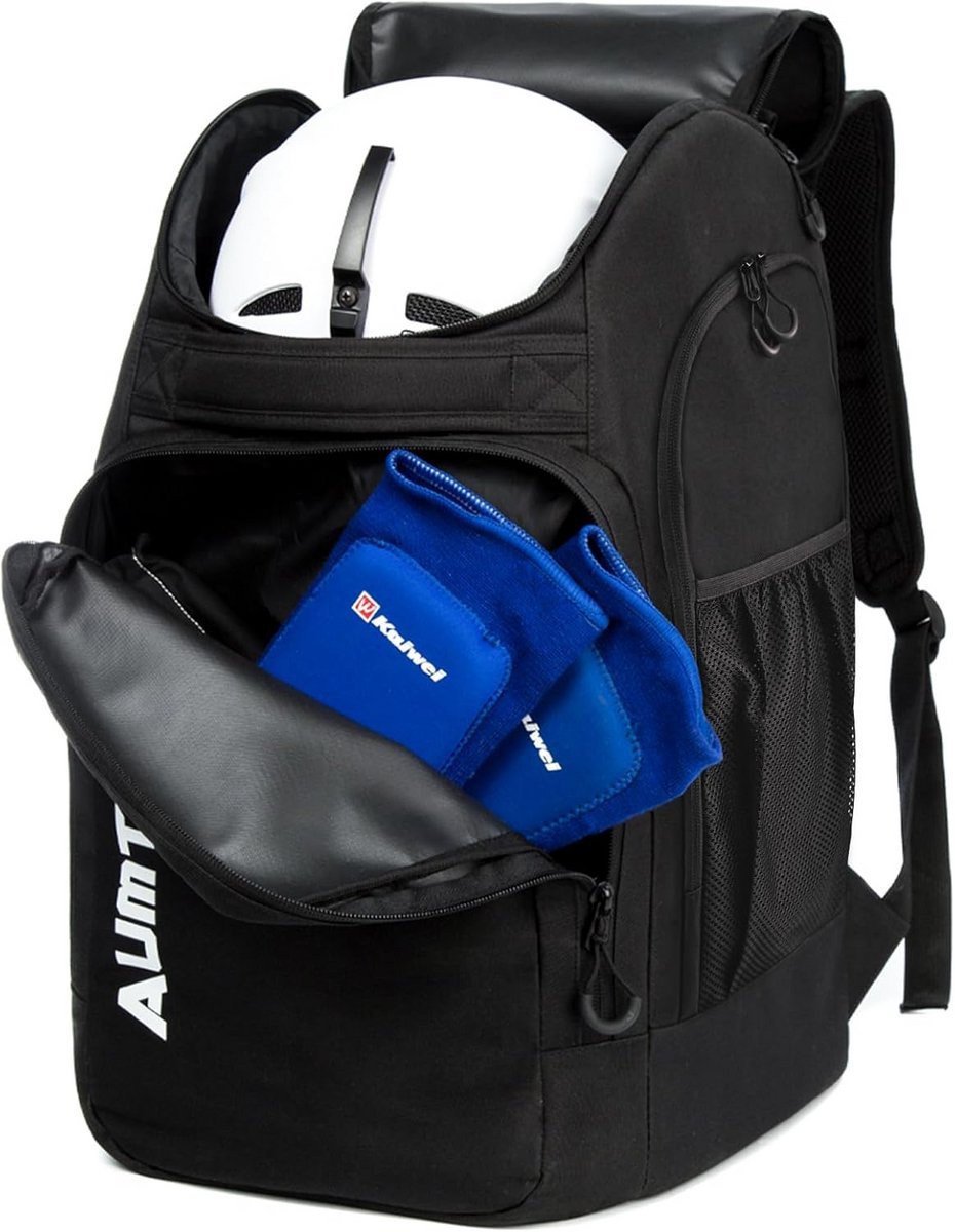 De AUMTISC skischoenentas combineert ruimte, draagcomfort en praktische opbergmogelijkheden voor jouw wintersportuitrusting. De hoofdvakken zijn geschikt voor skischoenen of snowboardschoenen en kunnen eenvoudig worden ingeschoven of uitgehaald dankzij de ritssluiting aan de achterkant. De dubbele naden, het gevoerde interieur en de gevoerde kussenbodem zorgen voor extra bescherming en duurzaamheid. De gevoerde en verstevigde rugzakriemen bieden comfort en handenvrije dracht. De bovenste en voorste zakken met ritssluiting bieden extra opbergmogelijkheden voor handschoenen, veiligheidsbrillen en andere accessoires. De tas is gemaakt van 600D hoogwaardig polyester en is waterdicht en slijtvast.