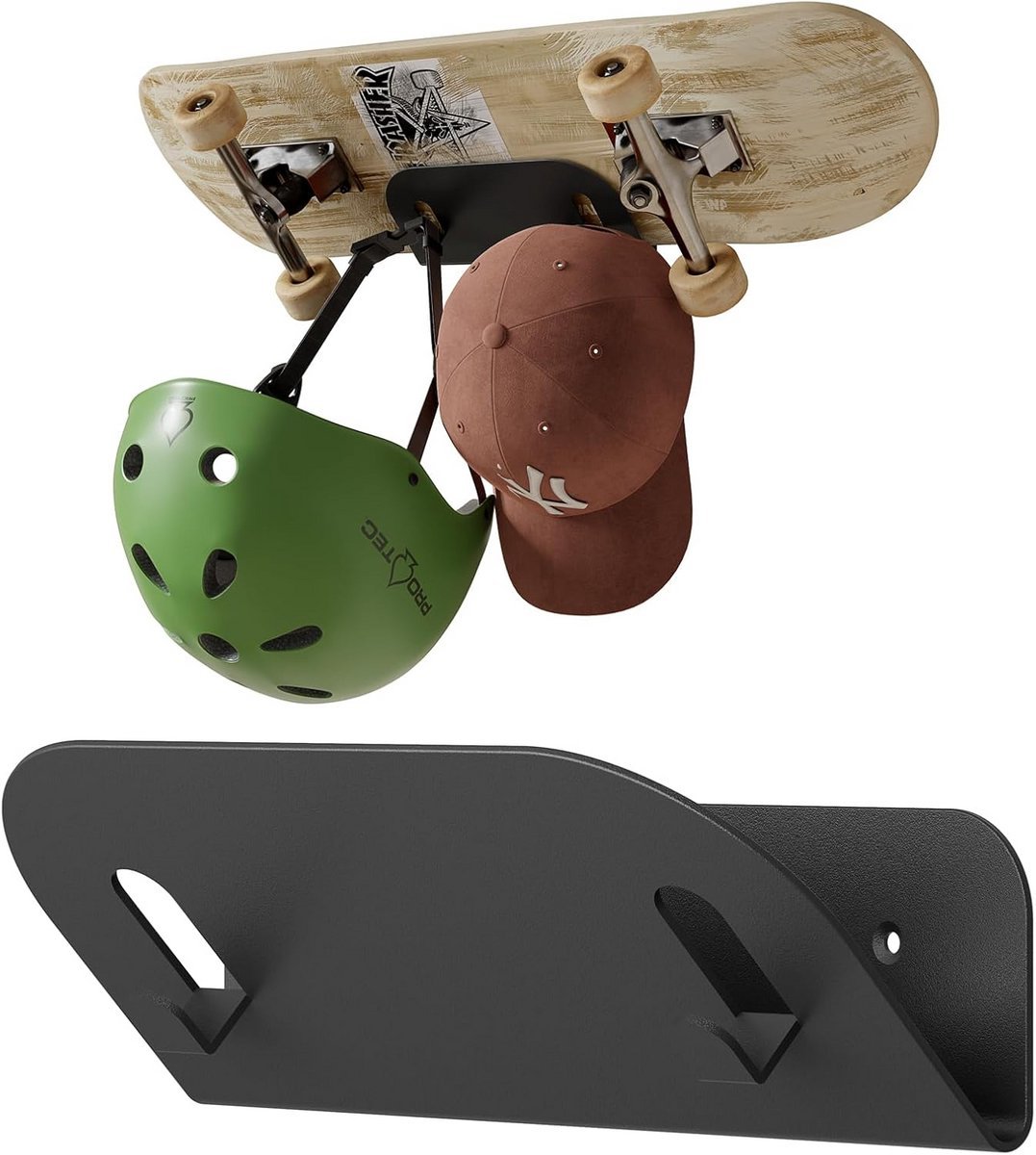 Houd uw sportuitrusting netjes georganiseerd en stijlvol tentoongesteld met deze heavy-duty metalen wandhouder. Dit veelzijdige stalen rek is ontworpen voor het veilig opbergen en presenteren van al uw boards en beschermende kleding. **Ideaal voor Diverse Boards en Uitrusting:** Dit rek is geschikt voor een breed scala aan sportartikelen, waaronder: Skateboards (standaard en double kick), Longboards (cruisers, pintails), Snowboards (twin, freestyle), Ski’s en Kickscooters. (Let op: niet geschikt voor surfplanken.) **Veelzijdige Opslagmogelijkheden:** Naast de hoofdsteunen voor uw boards, beschikt het rek over twee extra haken. Deze zijn perfect voor het ophangen van helmen, kniebeschermers, brillen, rugzakken en andere accessoires, waardoor alles binnen handbereik blijft. **Robuuste Kwaliteit en Veilig Ontwerp:** Gemaakt van 2 mm dik staal, heeft het rek een indrukwekkend draagvermogen tot 15 kg. Het oppervlak is voorzien van een krasbestendige en roestbestendige poedercoating, wat onderhoud vergemakkelijkt. Dankzij de afgeronde randen worden uw waardevolle uitrustingselementen beschermd tegen krassen. **Eenvoudige Installatie:** Het rek wordt geleverd inclusief alle benodigde montageaccessoires, zoals expansieschroeven voor een stevige bevestiging op verschillende muurtypen. De montagegaten zijn verzonken voor een strakke, professionele afwerking aan de muur in uw garage, hal of woonkamer.