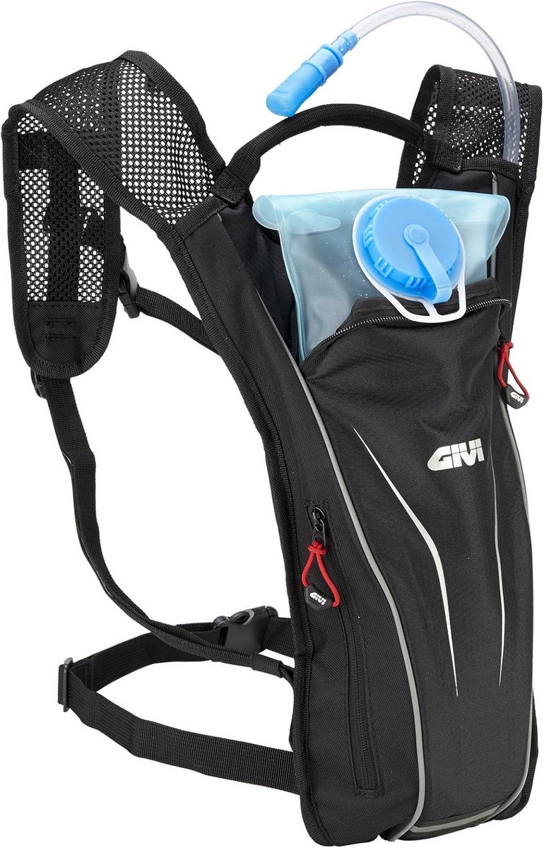 Vergrootbare motorrugzak, ideaal voor motorritten. Deze rugzak is voorzien van een waterzak voor hydratatie onderweg. Afmetingen: 170 cm hoog, 75 cm diep en 110 cm breed.