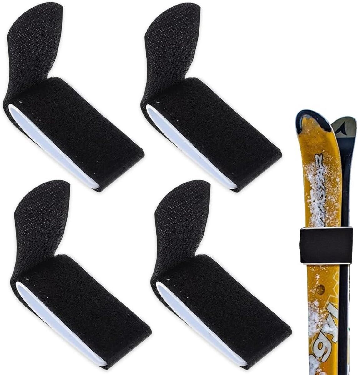 Set van 4 stevige, verstelbare nylon skibanden, ideaal voor het veilig vastzetten en comfortabel dragen van uw ski’s en skistokken. Het fijne en gladde ontwerp voorkomt krassen op uw skiplank. Gemaakt van duurzaam nylon in de kleur zwart. Afmeting: 11 x 5 cm. Perfect als accessoire voor elke skiër.