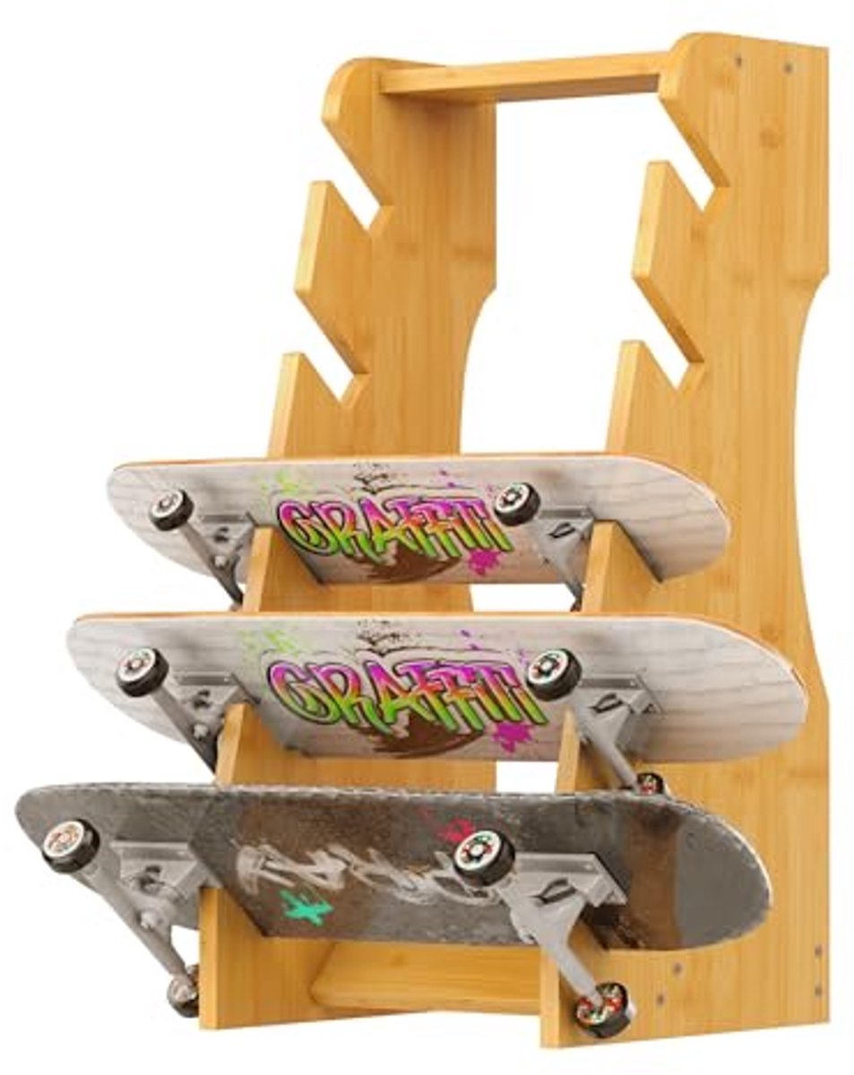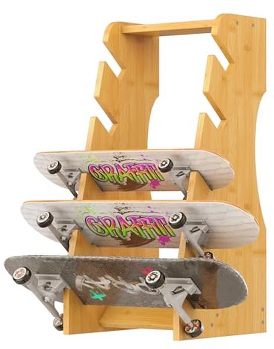 Dit vrijstaande skateboardrek is gemaakt van hoogwaardig natuurlijk grenenhout, licht en duurzaam. Geschikt voor verschillende soorten skateboards, inclusief longboards en penny boards. Met een hellingshoek van 75 graden biedt het stabiliteit terwijl het tegelijkertijd de designs van je skateboards weergeeft. De afmetingen zijn B33cm x D34cm x H74cm en het netto gewicht is 4 kg. Dit is het perfecte cadeau voor skateboardliefhebbers en ook ideaal voor gebruik in skatewinkels of sportzalen.